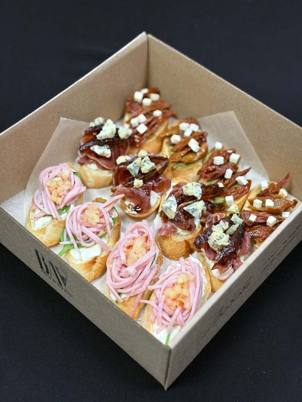 Брускетта с хамоном, финиками и гарганзолой, брускетта с муссом из авокадо и вялеными томатами, брускетта с ветчиной из цыпленка, ананасом и сладким чили.1600р