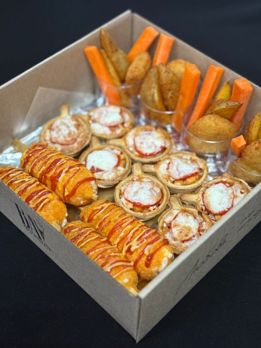 Тарталетка с соусом и ветчиной под сыром 4шт, тарталетка с соусом и цыпленком под сыром 4 шт, корндоги с сыром и куриной сосиской 4 шт, картофель и морковь с соусом.