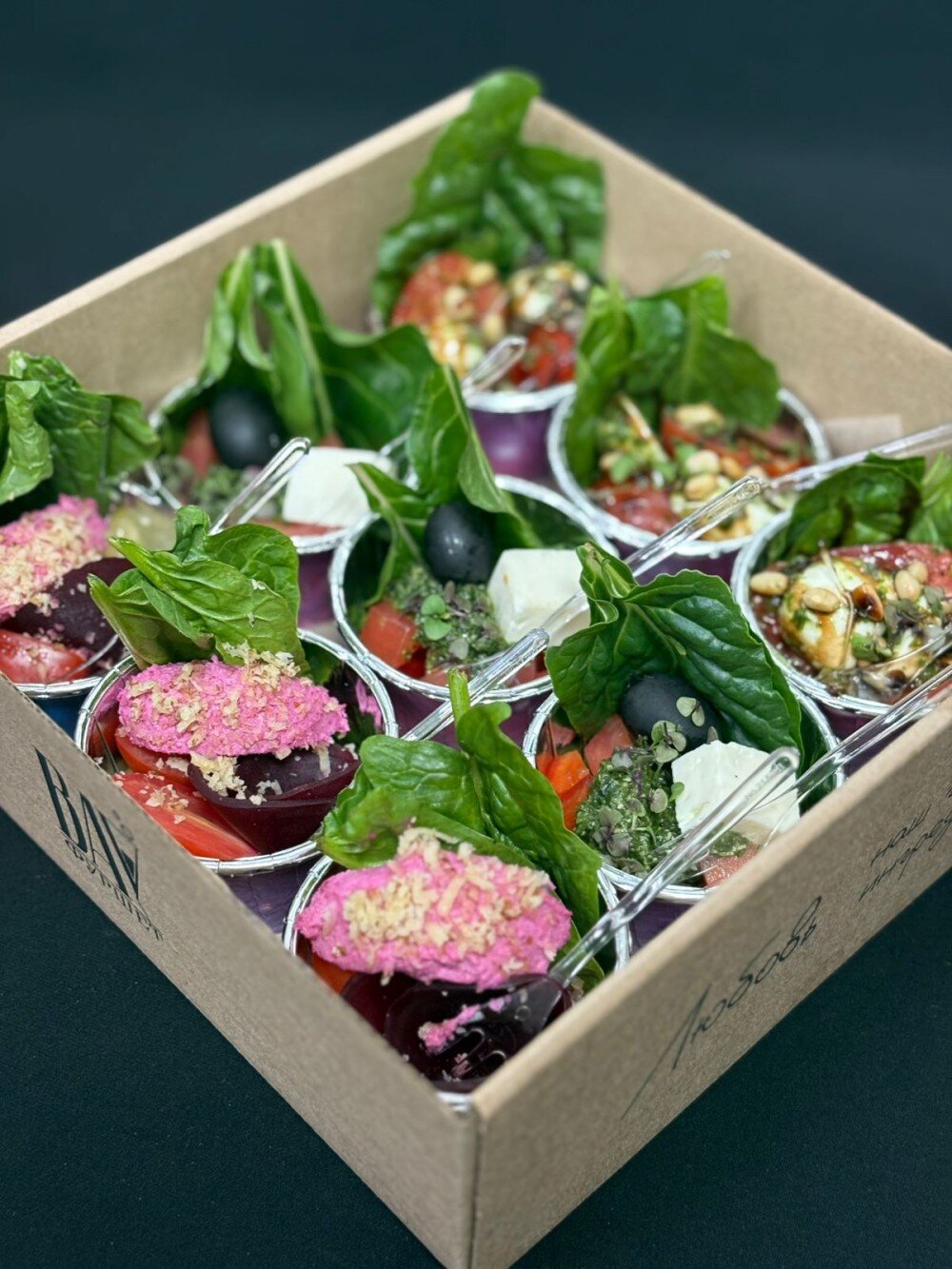 Салат с бальзамической свеклой 3 шт, Салат с овощами и брынзой 3, с томатами черри, моцареллой и песто 3шт.