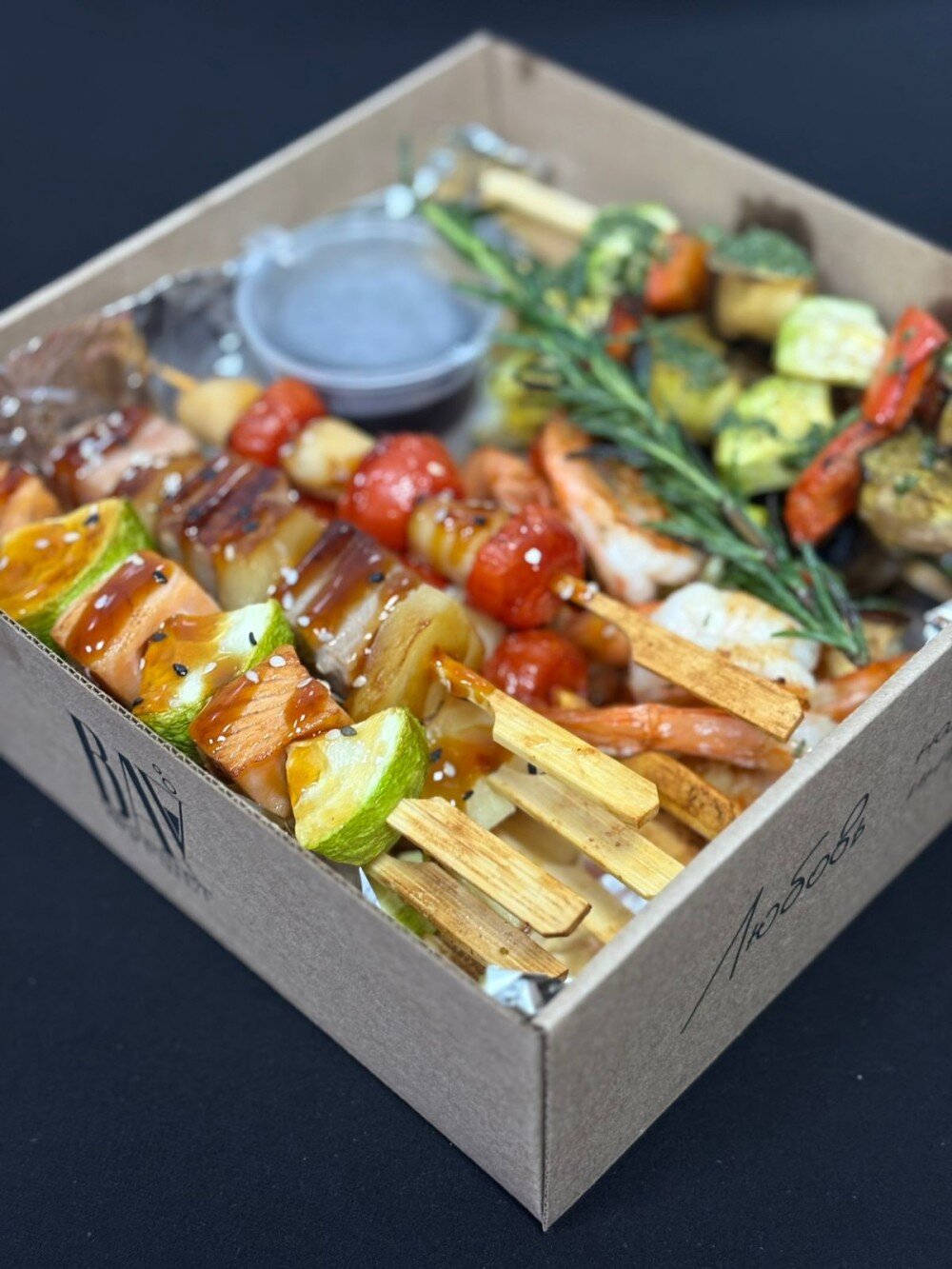 Шашлычки из лосося и цукини 3 шт, шашлычки из тунца 3 шт, шашлычки из гребешка с томатами 3 шт, креветки тигровые 5 шт, овощи печеные и шампиньоны. Соус унаги, соус ореховый.