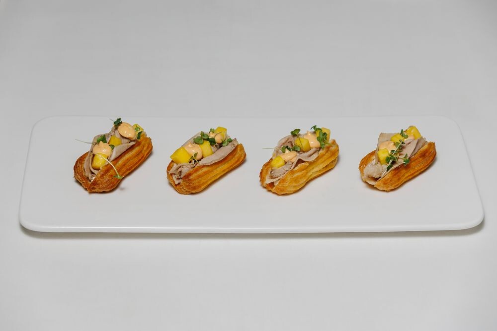 Эклеры с уткой и манго под соусом спайси
