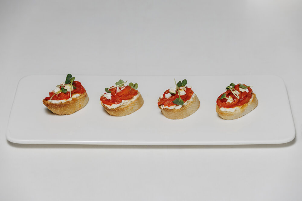 Брускетта с печеным перцем и луковым джемом с сыром фета